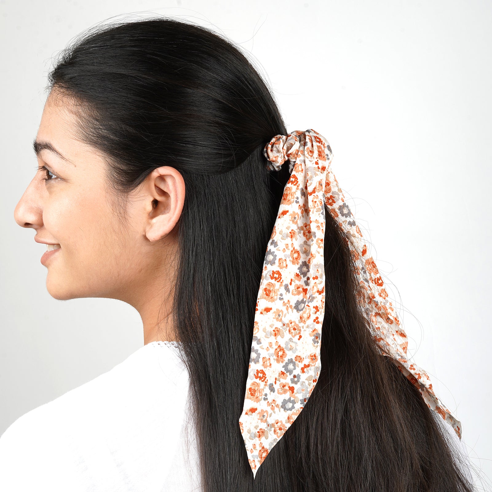 Wear your hair up with this classic scarf style hair scrunchie. Perfect for putting your hair up in a ponytail, around your wrist, and more. Don it with quirky casual for a fresh and fun look.