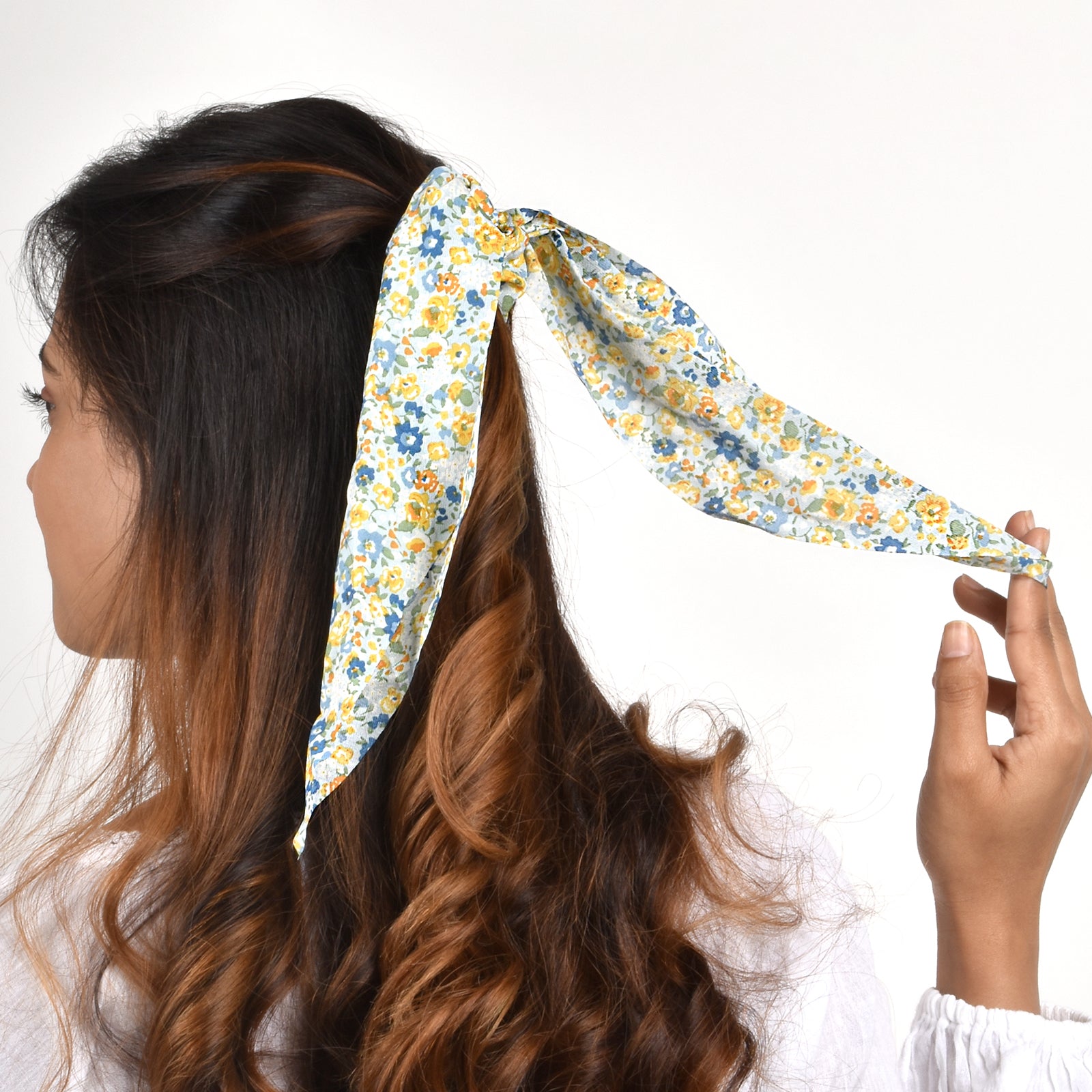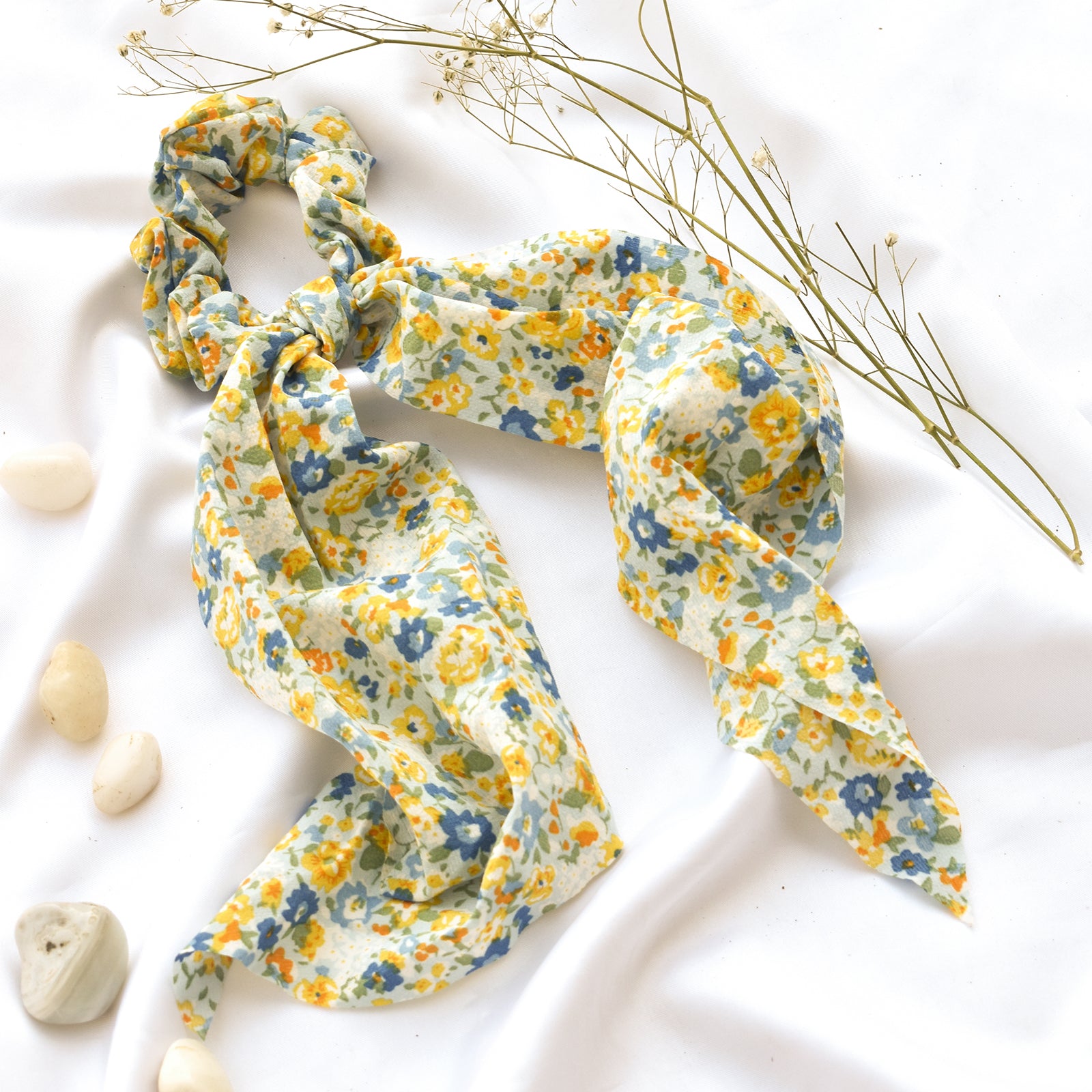 Wear your hair up with this classic scarf style hair scrunchie. Perfect for putting your hair up in a ponytail, around your wrist, and more. Don it with quirky casual for a fresh and fun look.