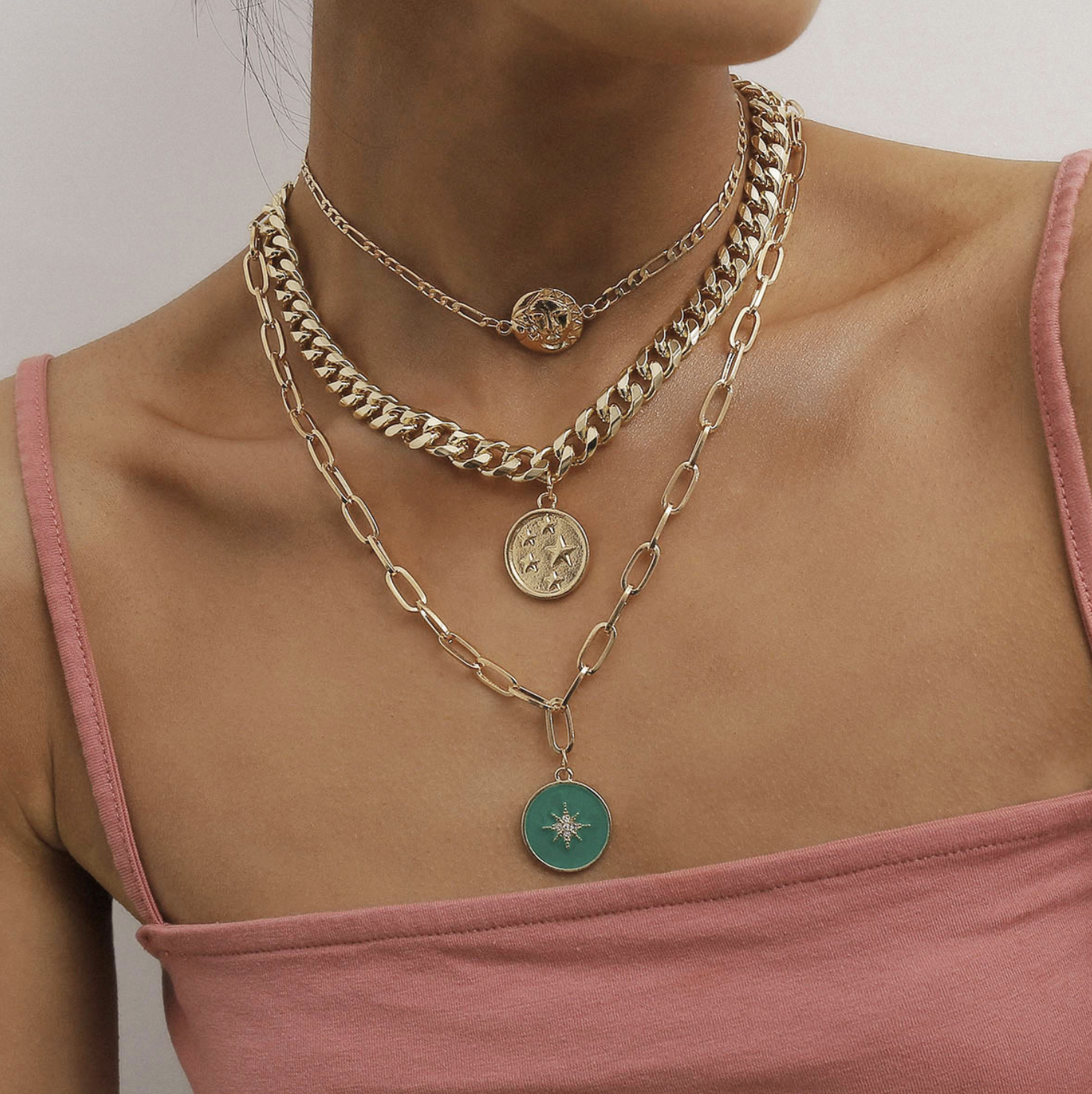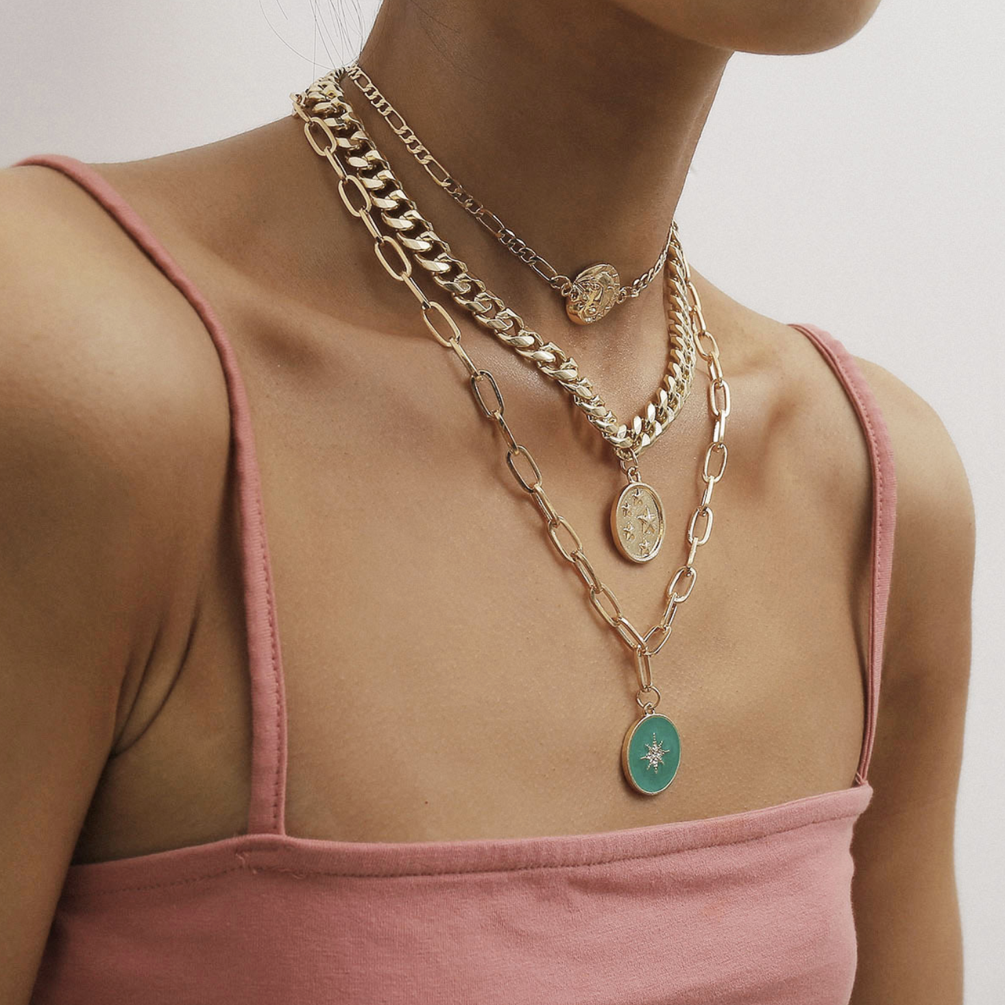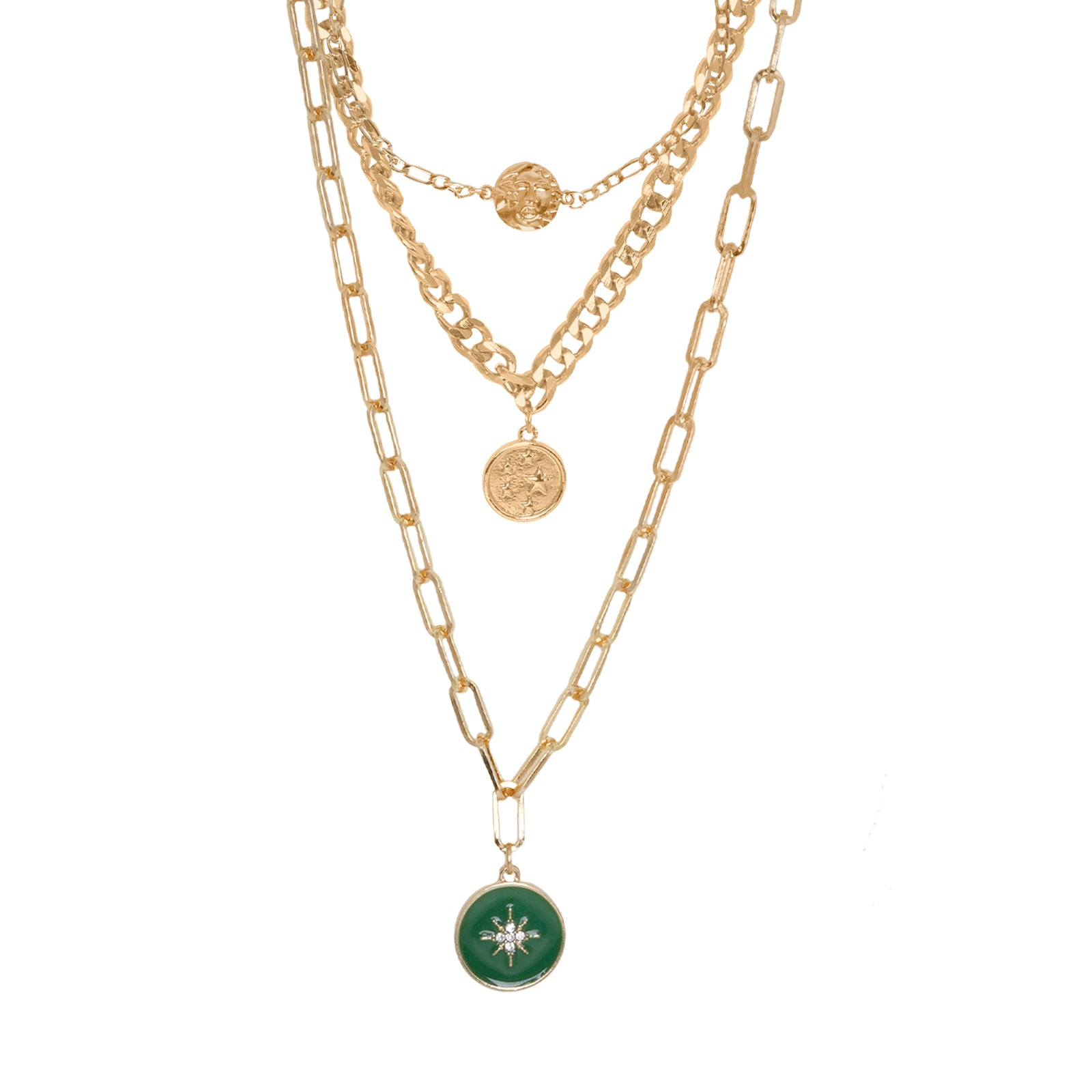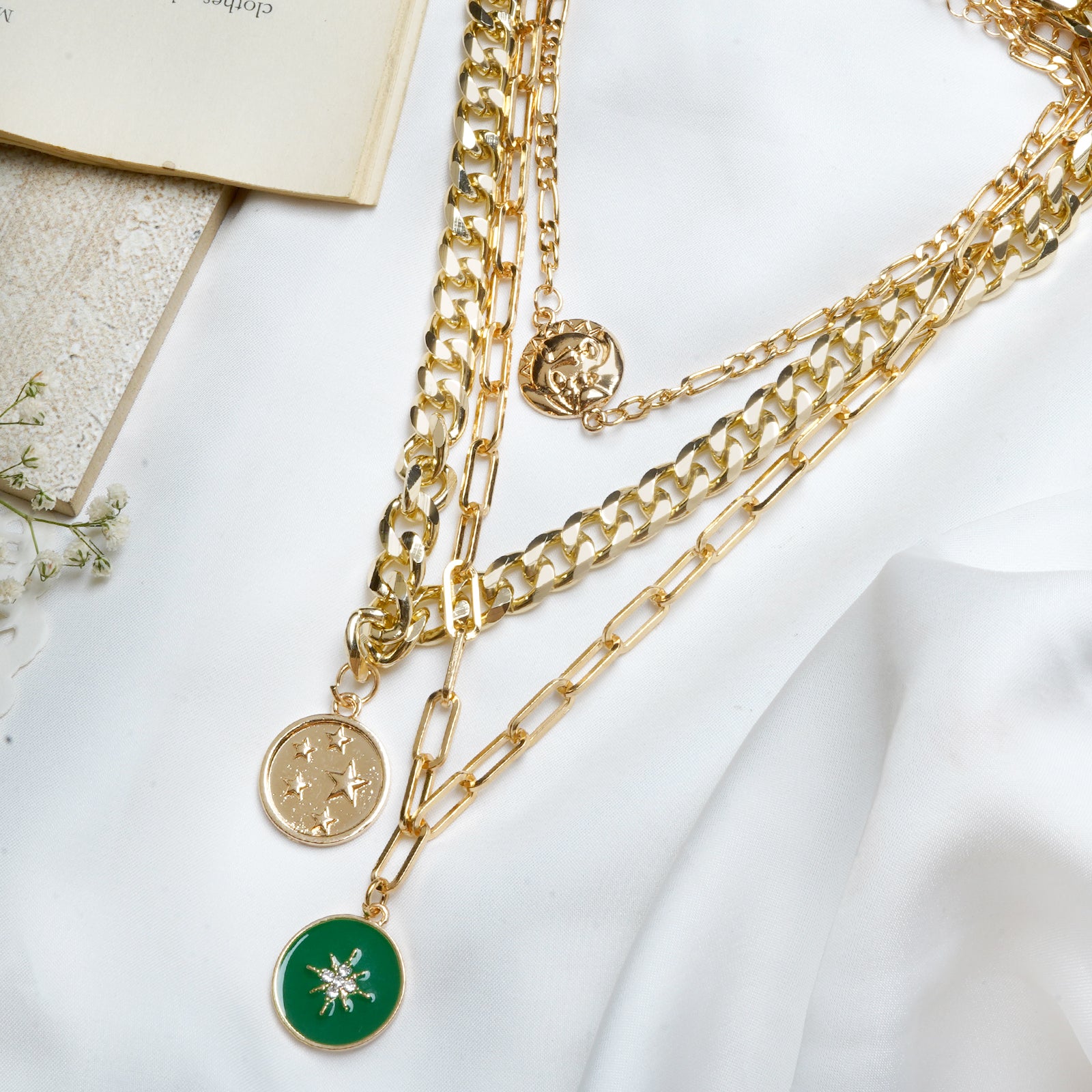 | Suit up for the season with the Teal Charm Link Gold Layered Necklace. This layered necklace is a stunner that features a gilded palette and each layer is different from the other. Ideally worn alone or with a pair of the gold hoop, we just know you'll have this piece on heavy rotation. |