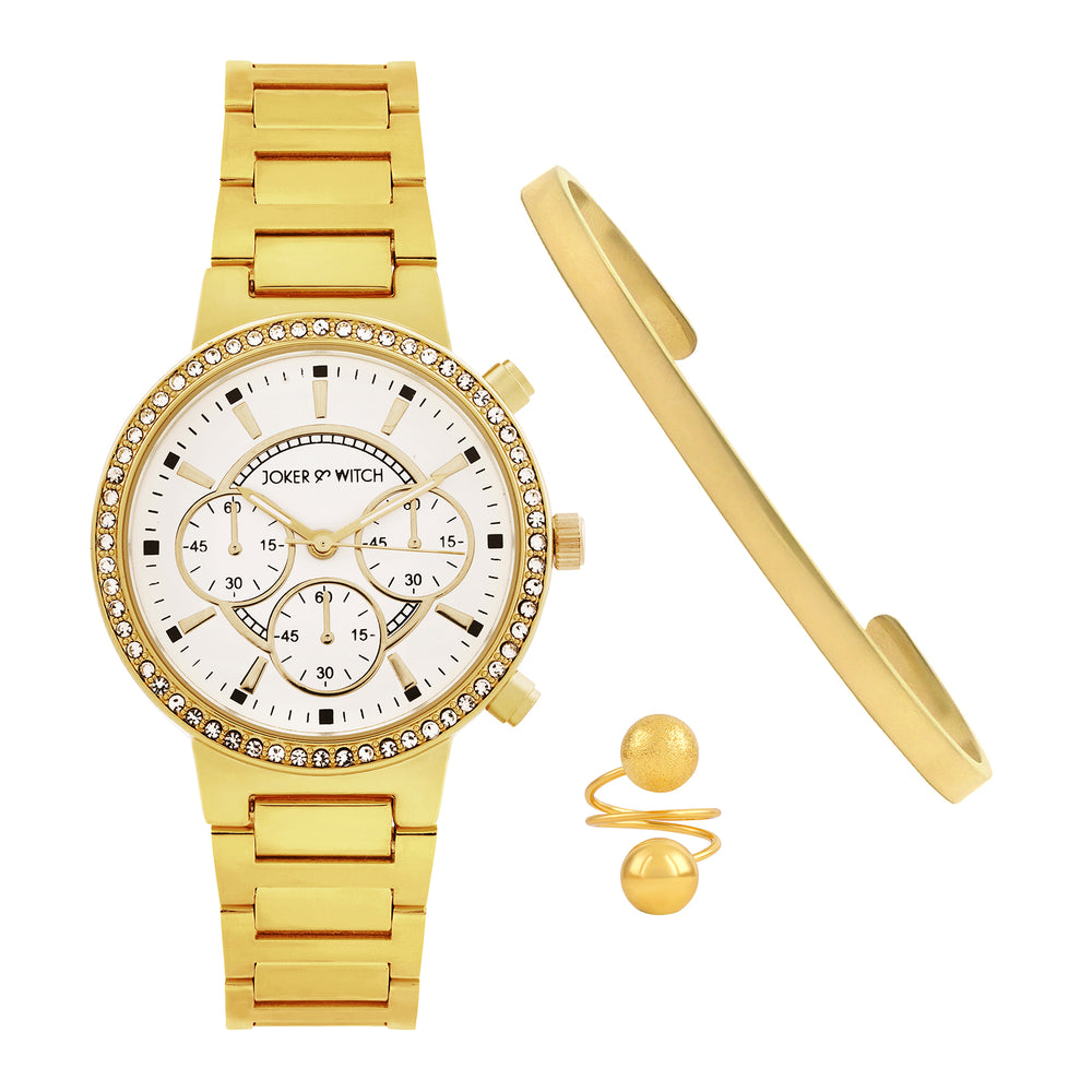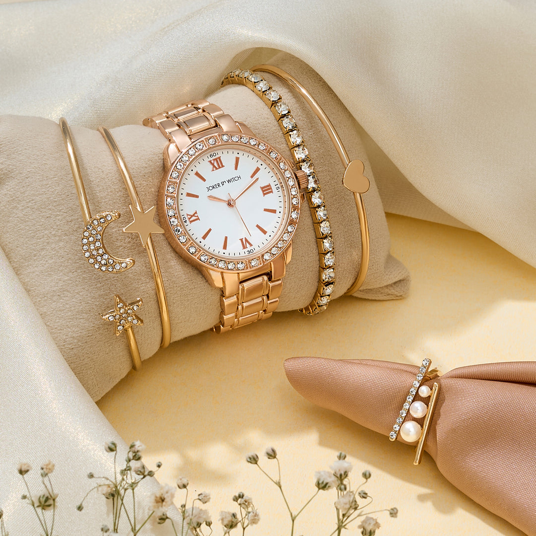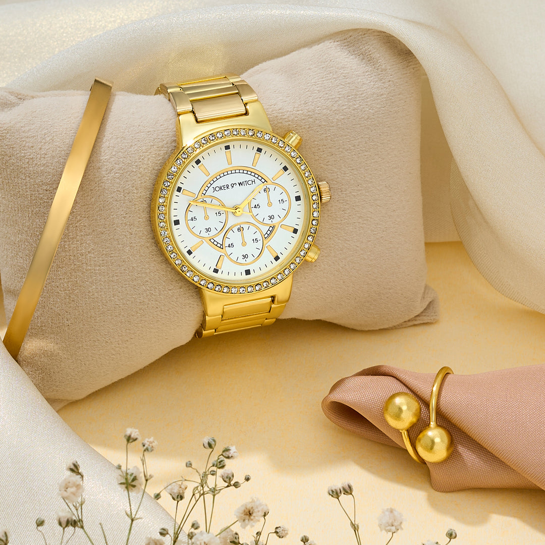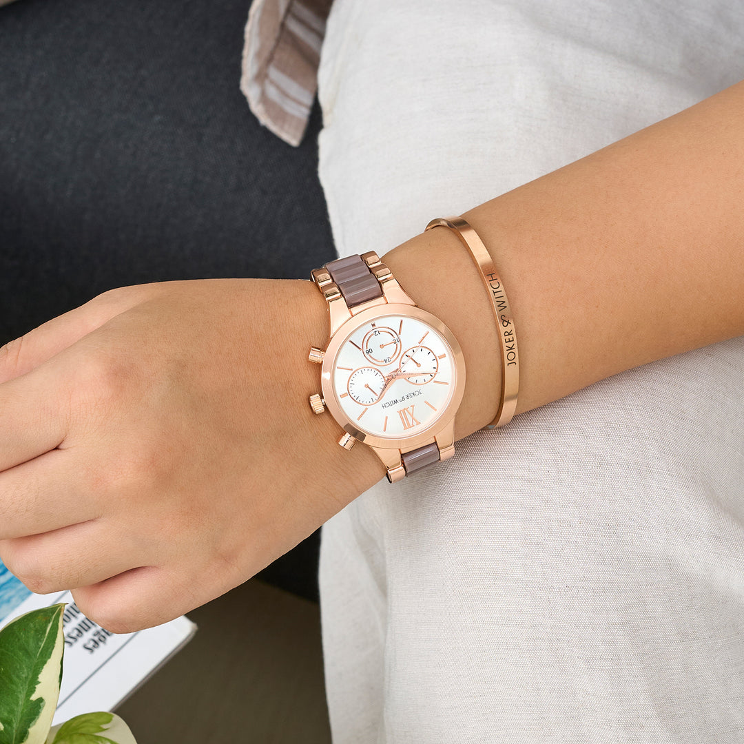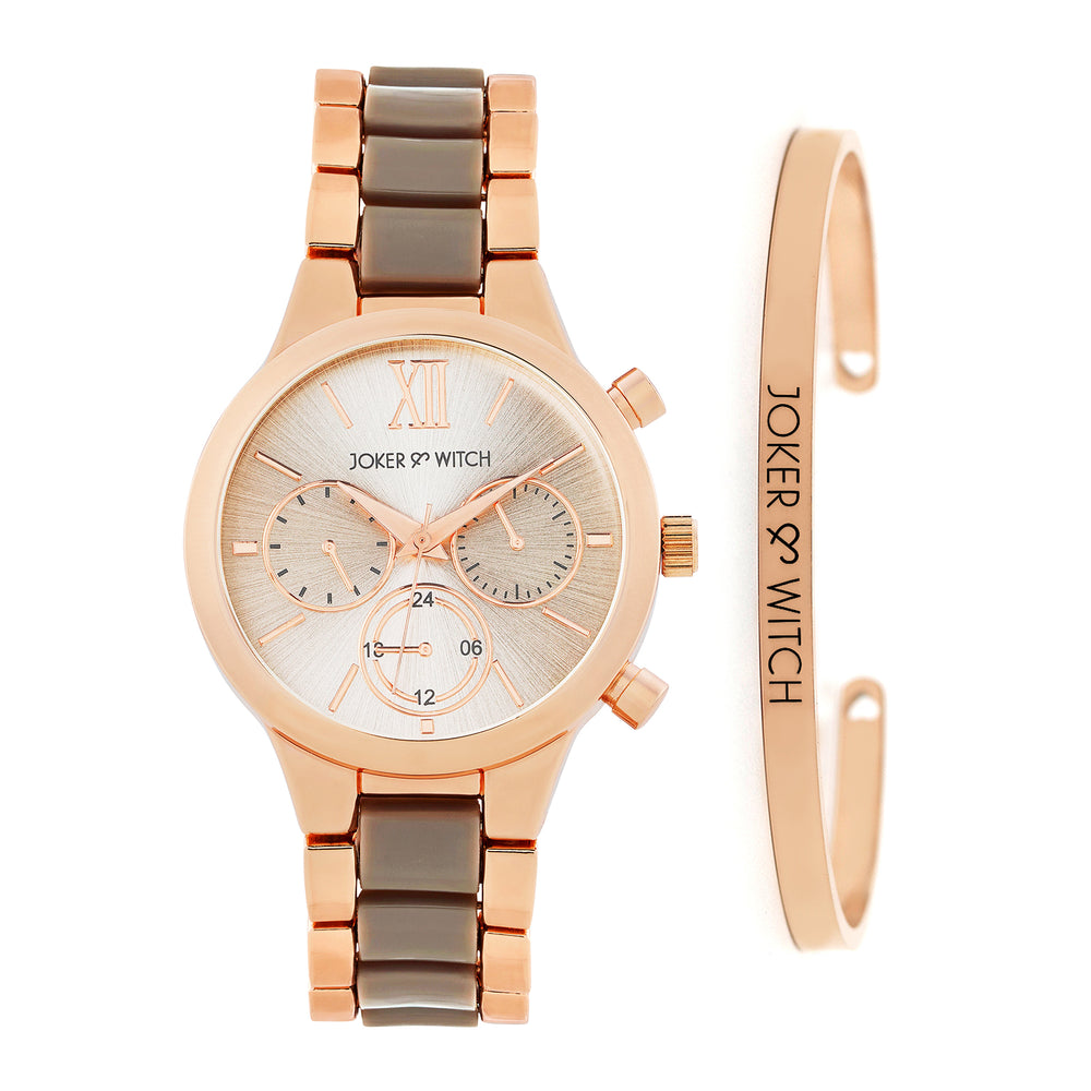 Suzanne White Large Rhinestone Dial Taupe Ceramic Linked Chain Strap Women's Watch