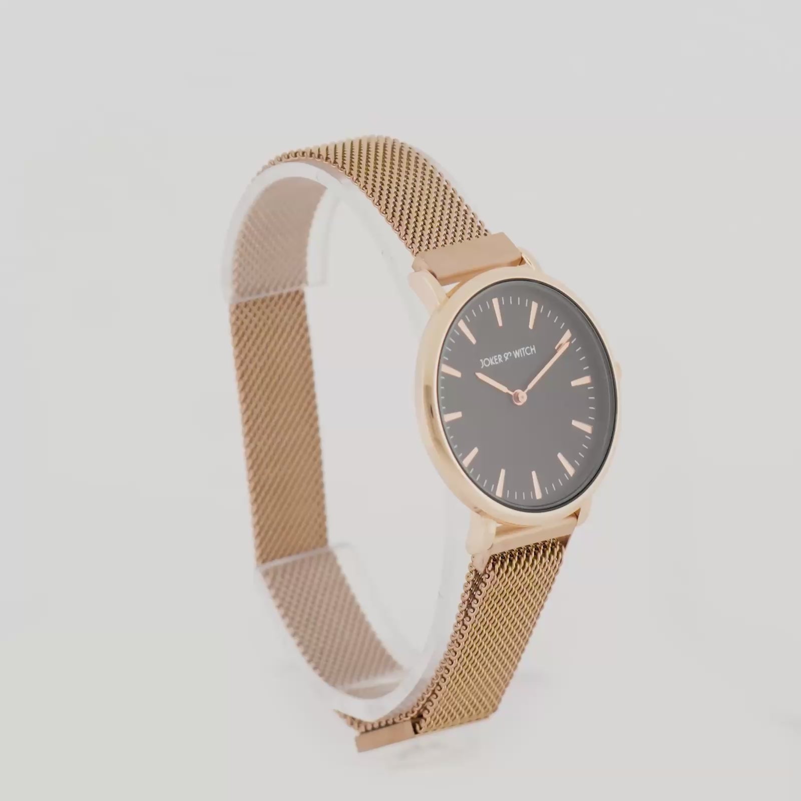 A Joker and Witch Classic! With a 36mm case, this stylish watch fits every mood. This Rosegold colored watch with its jet black dial and shiny markers will make you an absolute stunner among the crowd. Elegant and Refined, with stainless steel and classy mesh strap, this watch will surely be your favorite. With us, every day is an "ADD TO CART" kinda day, and we promise that this watch will be a valuable addition to your collection.