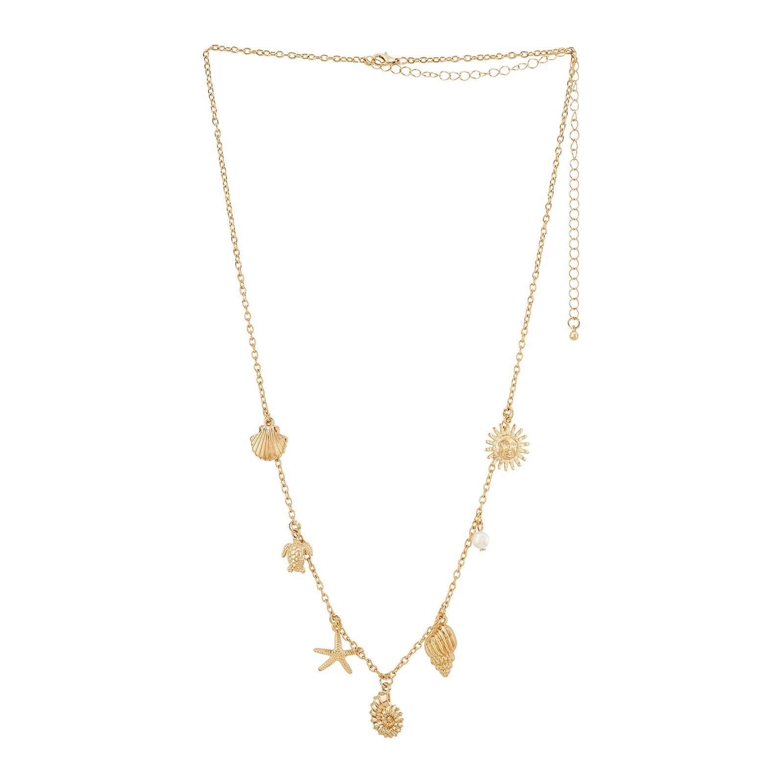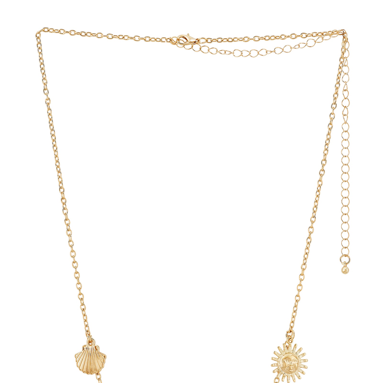 This Seashells gold-toned waist chain features finely detailed shell charms delicately spaced along a sleek chain. This piece creates a refined yet eye-catching silhouette, making it perfect for resort wear.