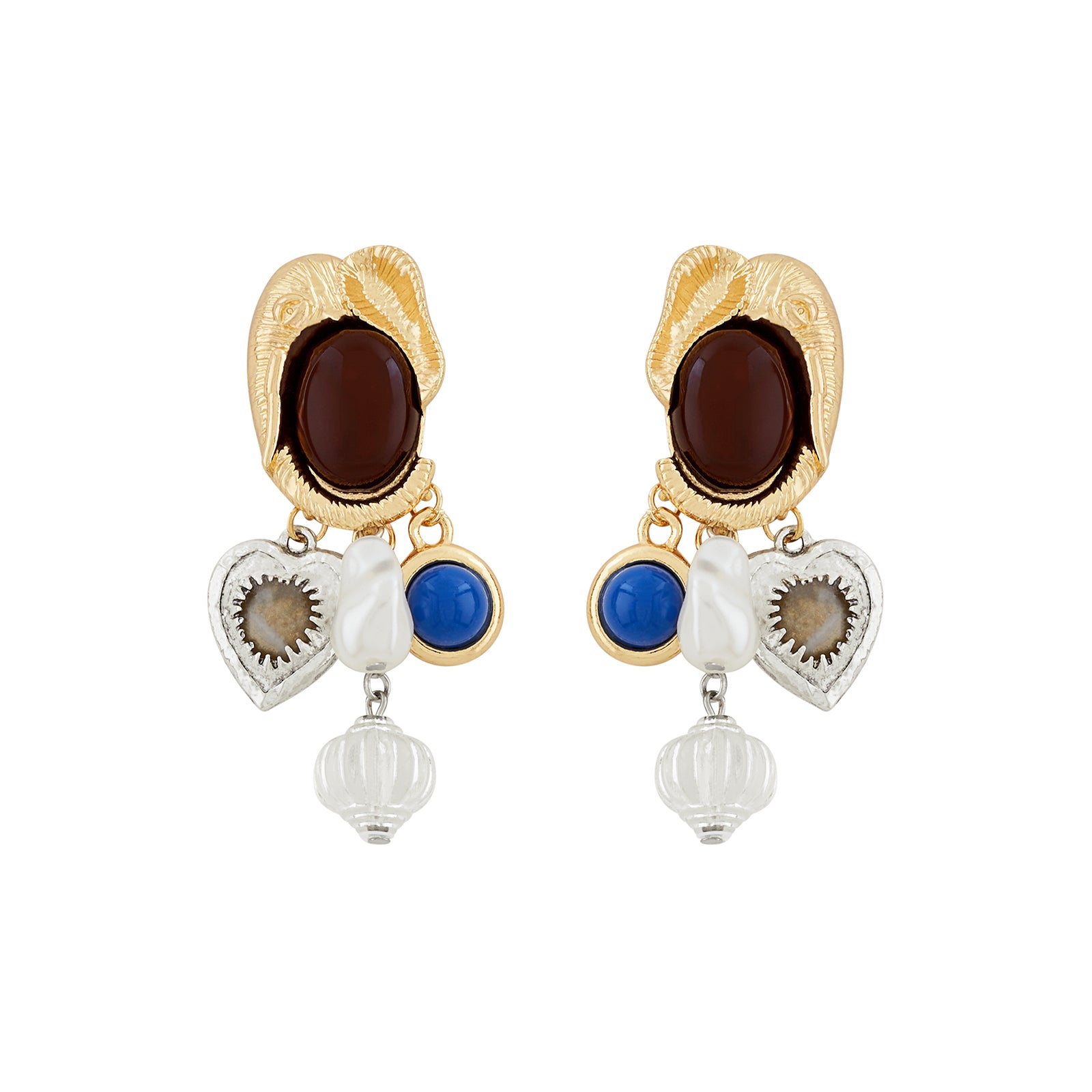 These gold drop Charm Seashells earrings combine sculptural studs with layered dangling elements. The top features a bold brown stone setting, followed by cascading charms including metallic accents, and blue-toned details.