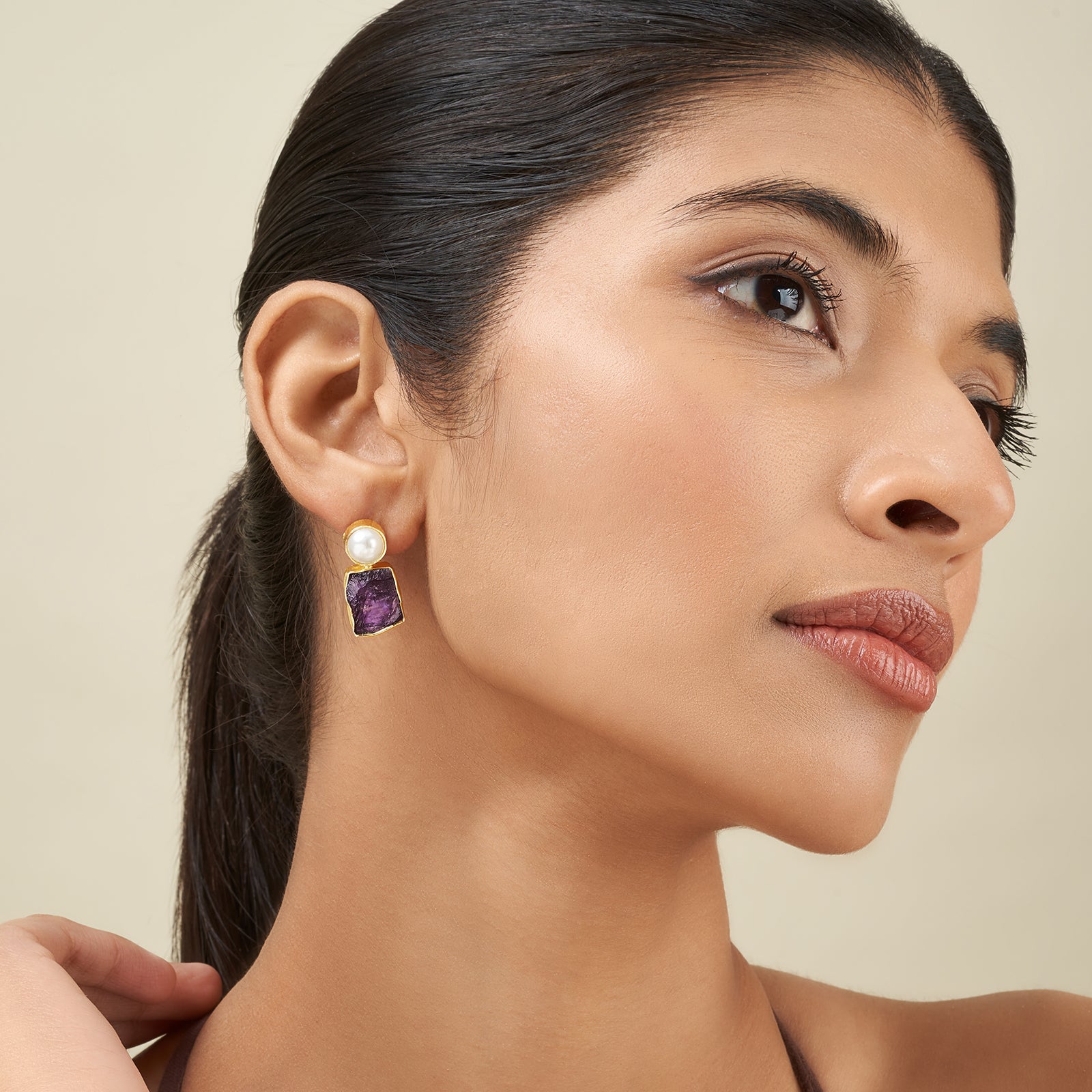 Minimal earrings with raw crystal in earthy tones, the kind of piece you’ll never want to take off.