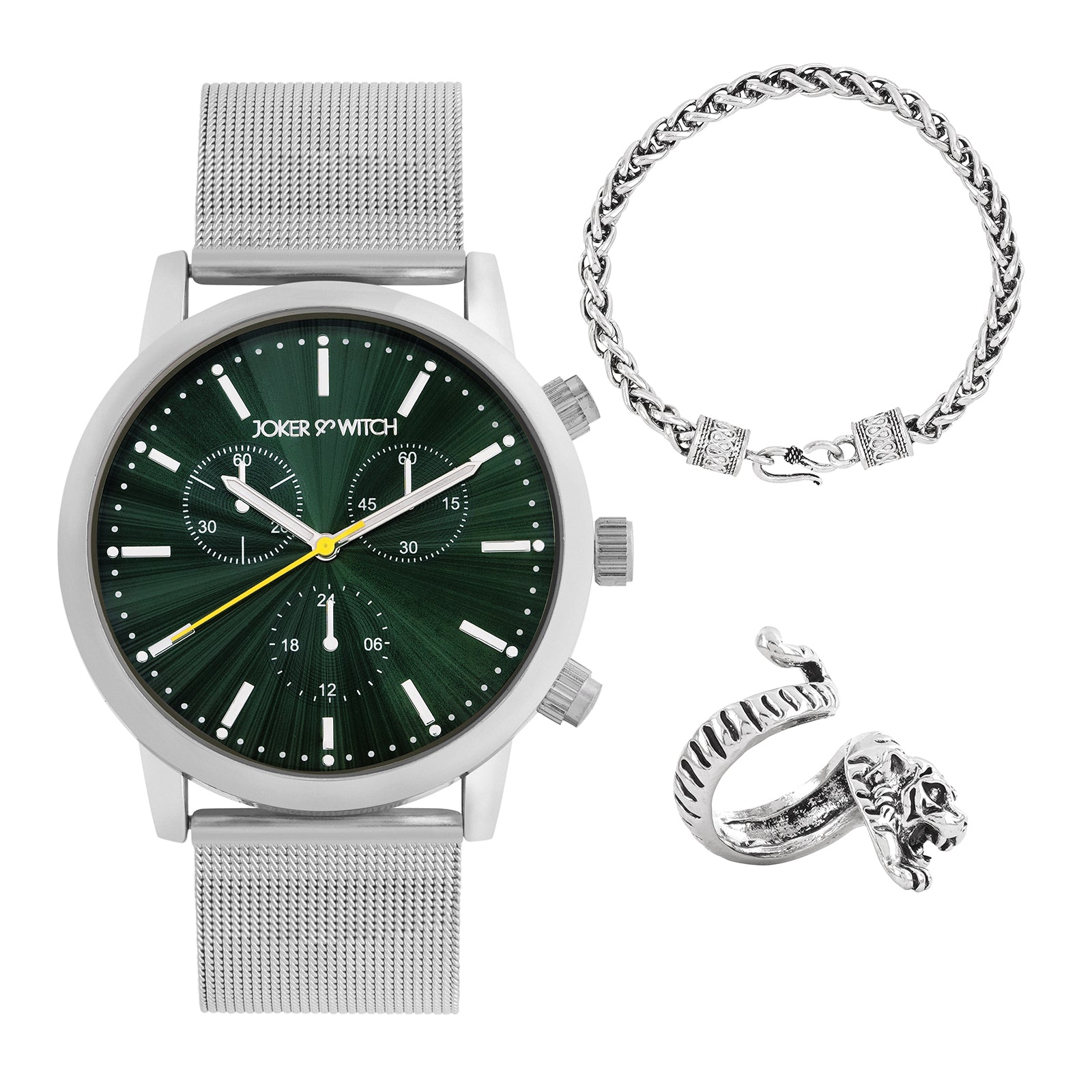 A timeless trio for every mood. This set features our dark green dial watch, a bracelet, and matching ring for effortless style.